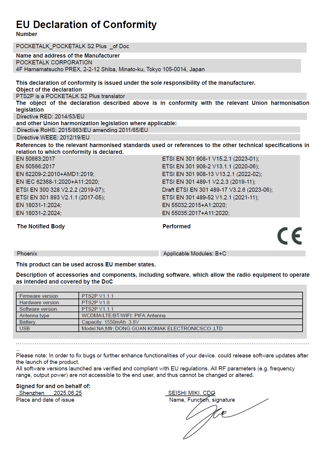 Hereby, POCKETALK CORPORATION declares that this device is in compliance with the essential requirements and other relevant provisions of Directive 2014/53/EU.