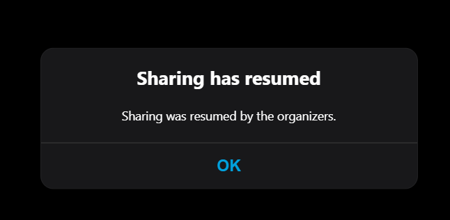 When the sharing is resumed by the host, a “Sharing has resumed” message will appear on the tour participant's screen.