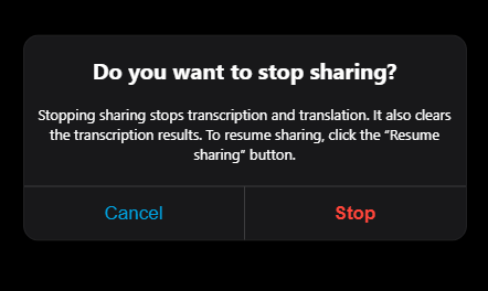 - interpretation will automatically stop after 5 minutes of no voice input. If you see 'Do you want to resume?' on the screen, clicking 'Restart' will resume the interpretation.