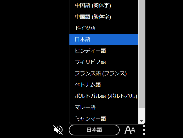 画面下方にある言語名をタップすると、言語選択リストが表示されます。ホスト・主催者が設定した言語に関わらず、ゲスト・視聴者は各々のデバイスで表示言語を選択できます。