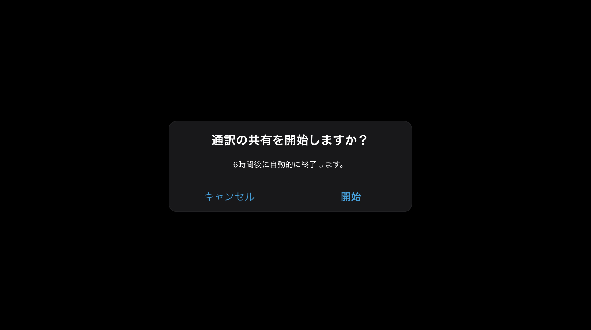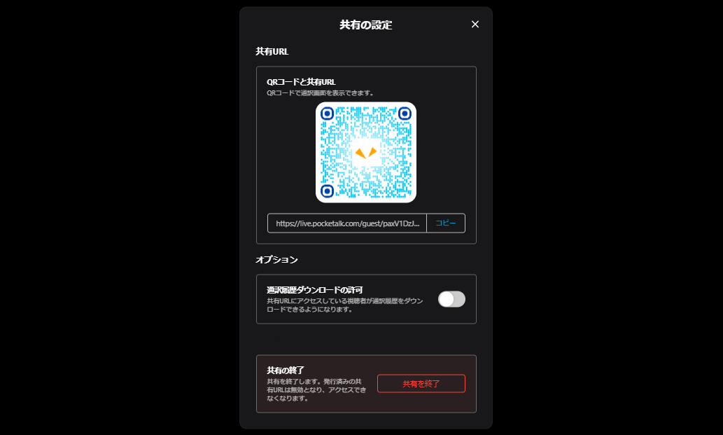 [共有の終了]ボタンを押さなければ、通訳を停止したりブラウザを閉じたりしても、URLとQRコードは6時間変わりません。6時間後自動で共有を終了します。